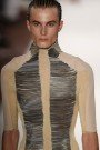 Inspiriation for this dazzling collection came from Darwin, the natural world, underwater aliens and technology. In a pressrelease the designer explained he was casting an apocalyptic forecast of the future ecological meltdwon of the world. We may be heading back to an underwater future as the ice cap dissolves. McQueens fantasy goes beyond borders . The dresses were molded and shaped, had engineered (reptile)prints and jacquards and came in breathtaking whorls of colors (greens, browns, aqua and blue). The platform-shoes were alienating. In a section in which it looked as if McQueen was envisaging a biological hybridization of women with sea mammals, there were trousers whose bulbous flanks mimicked the skin of sharks or dolphins. Some dresses and tops looked like large bubbles of water.