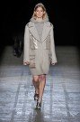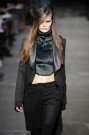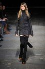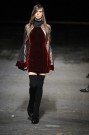 It looked like Alexander Wang took the traditional banker’s uniform – the darkblue pinstriped suit – deconstructed it and put it together again. The result was sexy and dark, almost with a Belgian touch. But where designers like An Demeulemeester and the early Martin Margiela put a lot of effort in the making, the cut and the fit, it seemed Wang aimed more at the effect. Cropped blazers, tailcoats and vests exposed flashes of skin and were worn with thick thigh-high legwarmers and chunky heels. Layering also played a part in this collection, but was less relaxed. For evening and partywear Wang chose velvet and chenille.