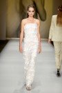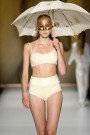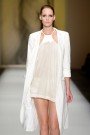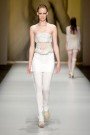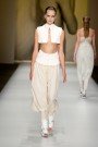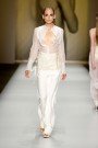 Besides the prints with LaLaLa, it was a collection with a true LaLaLa attitude. Strong and soft looking outfits were mixed, there were sharp looking artisanal white jackets with big shoulders. Some were knee-long, looking beautifully powerful. The Margiela-esque corsets made of leather ice-skateshoes in skin colors were attached to soft shirts, or mixed with skirts creating a confident look without being too severe. The golden leggings looked like armor All pieces were in soft colors – eggshell, skin, off-white – which gave the strong outfits an air of lightness.Sheer tops and pleated blouses covered more rigid pieces, making the outfits look not too serious. Evening dresses looked elegant, due to flowing materials. This collection proved that hard-edge fashion can be comfortable and fragile at the same time.