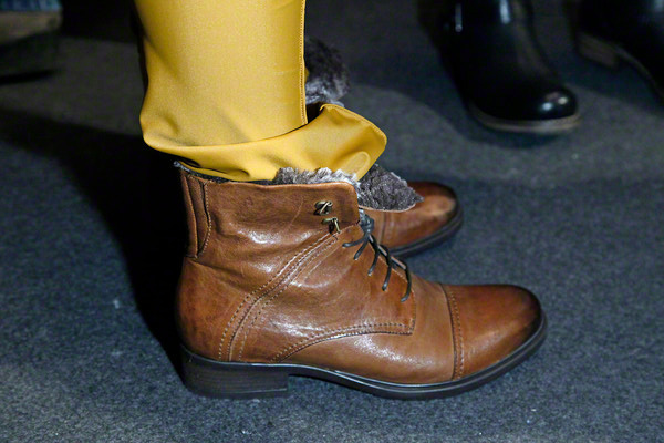 For this show it was American criminal Black Bart that inspired her. She takes us back to 1877, when he was one of the most famous robbers in America. Black Bart was familiar for the notes he left after every robbery. But is was especially his style of clothes that got her. Because no matter what, he was always dressed properly, wearing a three- piece suit and a bowler hat. But to keep anonymous he always wore something under his bowler that covered his face. And that she translated in some extravagant headpieces, like a blouse worn as a huge scarf covering a models face or a huge collar raised until the eyebrows. We also saw the classic menswear suit, but in a rough way. Like a leather pea coat or a denim blouse. And you must have noticed there were real man walking down the runway, among which Ferry van der Nat. ‘Yes, I used older men as models, because they have this typical faces which suits so well with the story.’