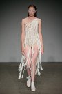 Fantasies of anxiety, Noir Near Future’s SS16 collection, started off very solid. Models with tight braided hairdos and silver lines on their faces appeared wearing either black dresses or black leggings with dito T-shirts, United Nude shoes to match. ‘Anxiety’ was printed on their outfits and backpacks, as well as (what appeared to be) frequency graphics. Disturbed and pixilated black and white prints.