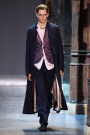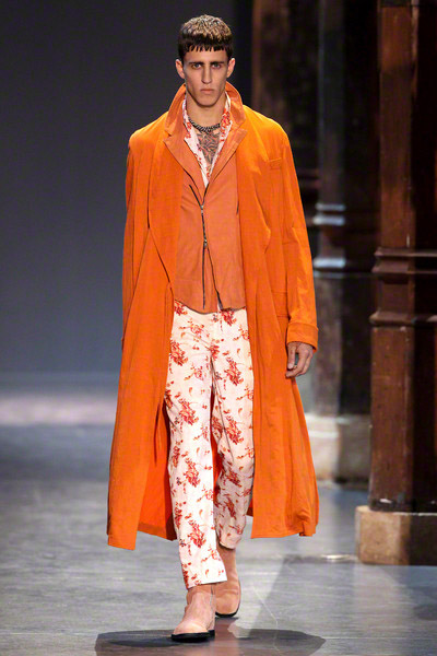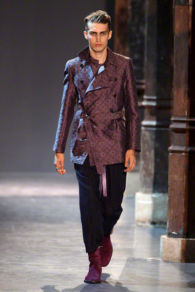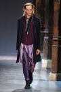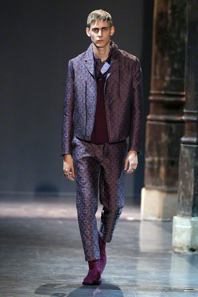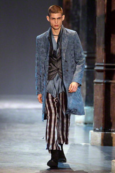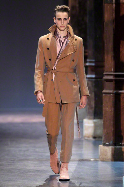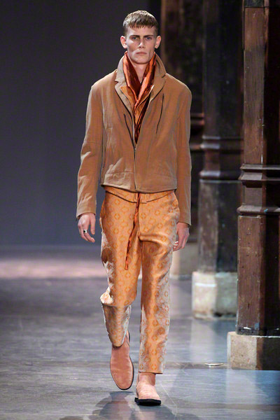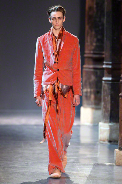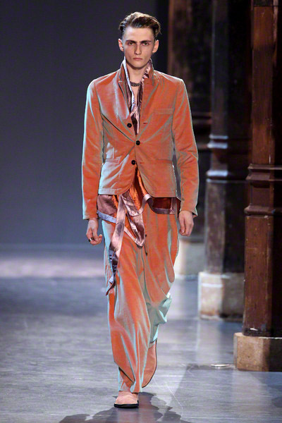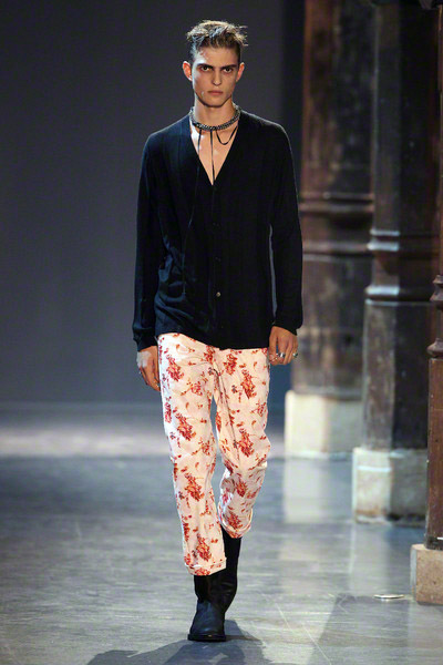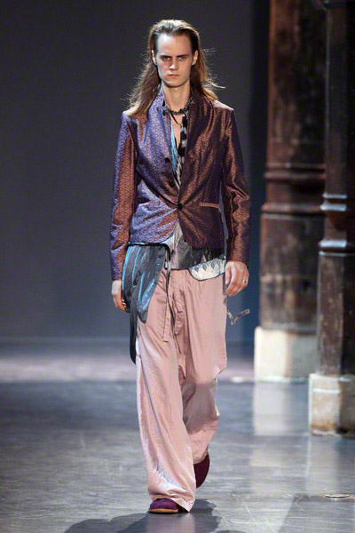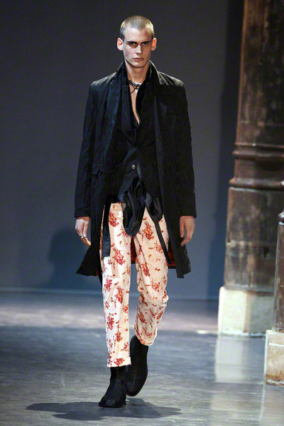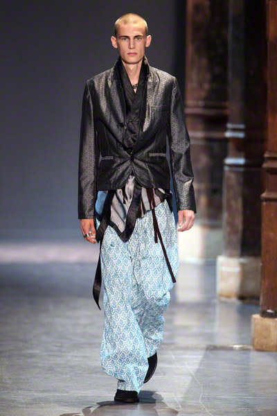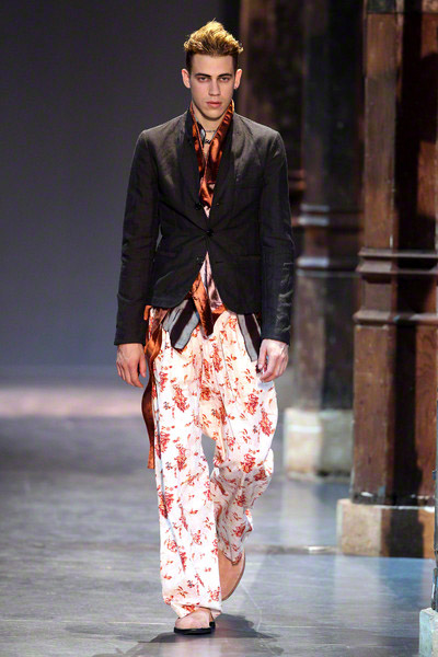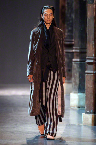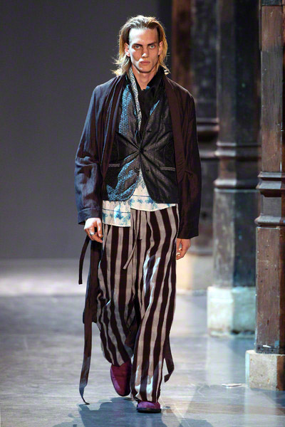She may have changed her color palette, but her man stays the same: romantic and a loner. Some oriental elements resonated in this collection, like the side-tied silk kimono tops bubbling out from beneath jackets, trailing sashes behind. Demeulemeester made it her own by undercutting preciousness with ease. She loosened her stricter silhouette with wide, soft pants, some printed with casual stripes or graphic roses.