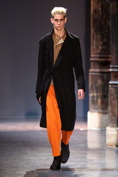 It was a romantic and gently deconstructed collection of Ann Demeulemeester with hints of antique uniforms. The designer gave the fronts of topcoats, jackets and waistcoats a used and beaten look, and most of the jackets peeled open in flaps at the waist. She also bleached fabrics to make ghostly patterns, sometimes sprinkled across a suit like a constellation. Pops of blue, red, yellow or orange broke the darkness, Demeulemeester used the colors for tops or they peeped out from under sheer black layers. The high, black ridingboots and leather gloves gave the models the look of a 17th century landlord, elegant, tough and a bit nostalgic