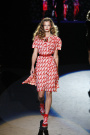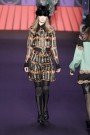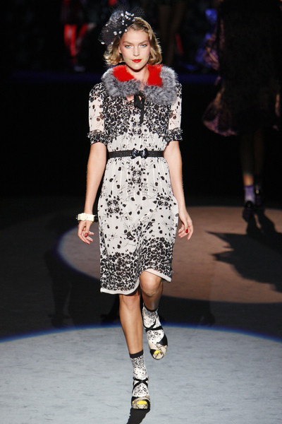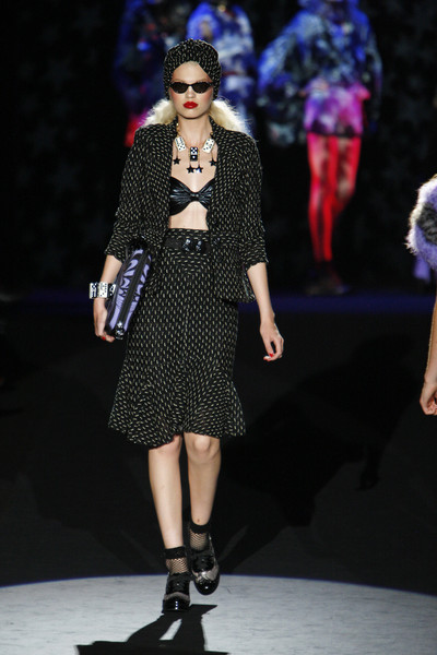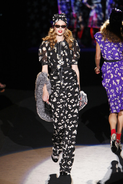 Then the collection got more colorful as warm shaded clothes with metallic accents appeared. Like Marc Jacobs Sui also introduced several polka dot looks, so we might be seeing a lot more of those next winter. Models wore crazy hats (we saw Lindsay Wixon with a cat head on) and obvious wigs.