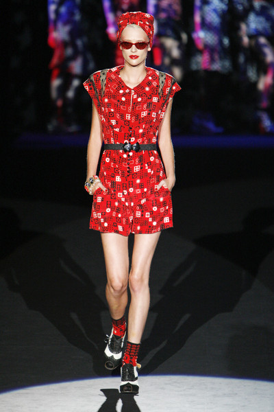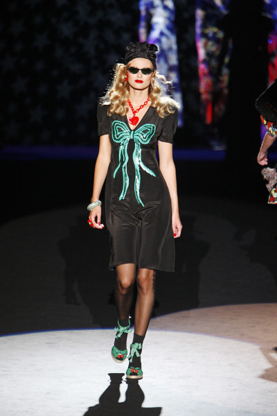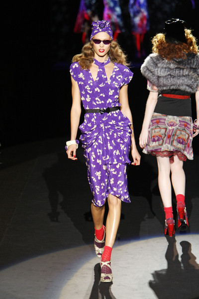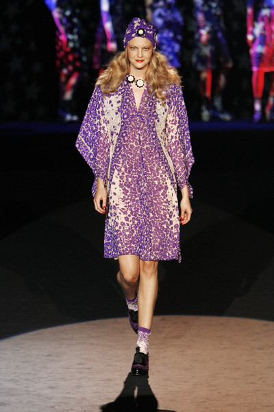Most of the designs were dresses, vintage looking ones in any kind of shape, mostly worn with a belt. The styling was over the top, very Anna Sui. The models wore turbans, sunglasses,chunky necklaces, headpieces, colorful socks and earrings, preferably all at once.