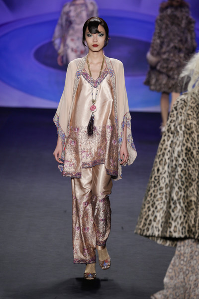 There were several flapper and cheongsam dresses and embroidered silk pajamas that, when teamed with fringed scarves and Mongolian lamb fur coats, had a boho attitude. The tweed jackets were charming, executed softly like a knit cardigan. Colorful Art Deco-inspired boots and tasseled necklaces added to the fun.