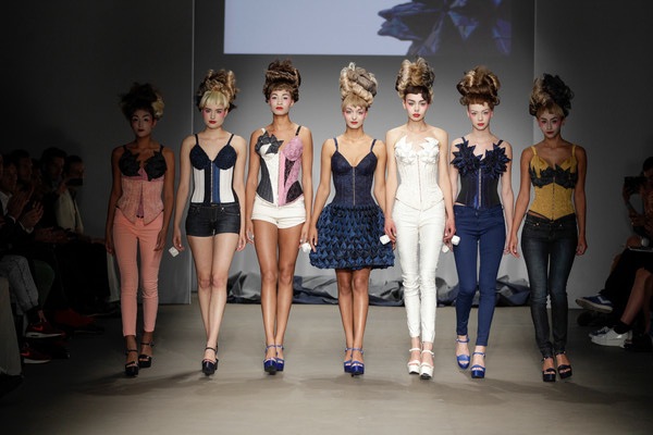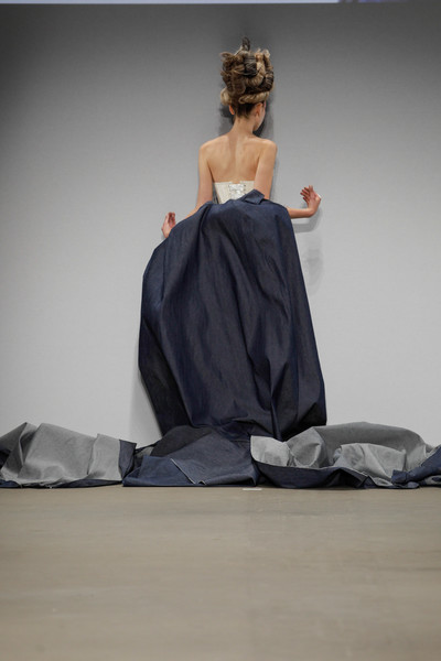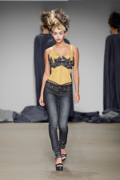 Six models with Dior couture-like make-up and hair all appeared on stage together at Armand Michiels. They wore long navy blye clocks and were turned with their back towards the audience. One by one they dropped their cloaks, turned around and showed what they were really wearing. A mix of denim and corsets, so it seemed. Geisha-inspired corset tops (for all kind of different occasions) in different shades with sculptural origami details in the front, laces at the back and color coordinated jeans or shorts, plus platform heels to go! We’re not exactely sure in which category Armand belongs; but it was an interesting mix of casual and couture.
