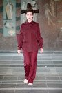 Klaudia Stavreva (Macedonia) presented her collection BOSSTVRVA. Inspired by the Sworn Virgins of Albania – women who assume the life and rights of a man, vowing not to marry or have children – she proposed a new, inverted way of power dressing – both sensual and strong. Modified garments, shapes and embellishments reference classic menswear, work wear, military dress, and Macedonian folkloric dress. Luxurious detailing, embellishment and fabrics clash beautifully with the hard signature menswear references.