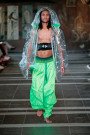 Oversized, easy shapes in combinations of jacquards with plastic, canvas or tarpaulin are manipulated by belts, gathering towards the body, or by folding the big darts outside. Lotte is nominated for Hyeres 2017.