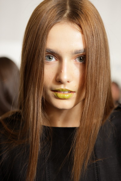 Of course there were exceptions. We could see dark smokey eyes, white-painted faces and strange-looking eyebrows. We also noticed some colorful lips passing by. Altogether nearly every possible shade of red was used for the models’ lips. Some bright colors like blue (Paul Smith, Doo Ri), green (Iceberg) and orange (Loewe, Prada) were shown as well.