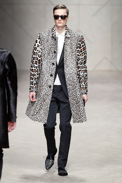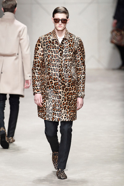 But when look #12 came on it was clear the leopard was a bigger theme for Christopher Bailey’s I Heart Classics collection. A zebra printed collar on one of the coats was followed by fully leopard and zebra printed patent leather jackets. Bailey teamed up his wild side with some looks in army green and then went on the spread the love. Literally by introducing a heart shaped print on several shirts, sweaters and one of the short scarves.