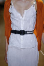 It’s needless to say that velvet is a huge trend this season.The venue of the miu miu show was even designed with velvet seats in orange, yellow, blue and green. It already gave us clue of what was about to come (and something very comfy for our bum to sit on after so many shows, good thinking Miuccia). So of course it didn’t surprise when the ribbed velvet outdoor jackets came along. It makes us wanna skip summer and go straight on to winter 2016 (okay, that’s a lie, but hello wish list material). Just like another big player in this show: denim. If you’re planning on taking your love for the blue allrounder up to a next level, Miuccia gave you plenty of inspiration too choose from. The blue garment was in almost every look, wether on top, bottom or head to toe denim, just make sure you wardrobe counts some denim jackets, blazers, maxi-skirts, blouses and trenches. Cause nothing more versatile, wether you combine it with white shirting, military tailoring, waxed outdoor jackets, tweeds and wallpaper jacquards. The third big player were pearls, seen on purses, belts, the rims of several eyewear and pearl-encrusted sandals. And we couldn’t help but silently laugh when seeing the pearly baubles on top of those fluffy flip-flops. In the end, that’s what Miuccia wanted, she told everyone. She wanted it to be fun and get people excited. No wonder why the label also recently launched a new app called Miu Miusic (great name by the way), bringing together music, technology, graphic design, and the label’s runway shows. This woman knows how to play her business on every level and it’s great fun for sure.