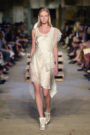 It’s hard to top the Zoolander surprise appearance during their last FW2015 show. Derek Zoolander and Hansel (aka Ben Stiller and Owen Wilson) showed up at the end of the Valentino show, each doing his world-known “Blue Steel.” It took the social media crowd and fashion world by storm. Would they pull this off again, without this huge crowd-pleasing element? The show may not have been as spectaculair and entertaining, its theme was about performance though, yet on another level. They dragged us into the magic world of ballet and modern dance, inspired by the movement of ballet dresses and dance films such ‘They shoot horses don’t they?’ With Vanessa Redgrave. Something that fits perfectly with the Valentino signature of romance, grace, sensuality and underlining your femininity. A world that asks for the ultimate perfection on every surface, a language that’s fluently spoken in Maison Valentino. But we can all remember the Black Swan movie, and perfection sometimes drives you to the most dark places, so it felt like this collection was exploring both sides. Delicate tulle skirts with golden stars referred to the punk ballet style of Karole Armitage, an embellished black tutu worn over a chunky knit, laminated and artistic fringes dancing around the body, tutus worn as meagre tops and the guitar cross body straps. But also crystal-embroidered nude-color tulle dresses, fragile transparencies, silk stockings, fluid draperies, pale pink silk dresses and a blush coloured sequin dress worn over knitwear. We counted so many knockouts it’s impossible to mention them all. Their goal was to let us be in the moment, and only this moment. Which wasn’t a hard job with such a mesmerising collection in front of you and that was supported by an actual pianist who is playing compositions by John Cage and Philip Glass.