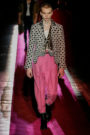 Models marched down two long catwalks in androgynous looks — a leopard-print coat and pink tracksuit trousers worn with furry orange slides, or a dark coat, its fur lapels done in tutti-frutti colors. Contrast, go-faster stripes stretched down the sides of trousers or came as furry strips on jacket arms.
