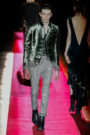 “I’m always attracted to the elegant man, but I’m always kind of a mess,” said Haider Ackermann backstage ato WWD after his his wild patchwork of a show. The collection had a punk feel, with magnified houndstooth fabrics patchworked with black leather for vests and jackets; a long, dark red military style coat, and plaid, checked or striped trousers, some with tartan tops knotted around the waist. Velvet played a starring role, patched together with leather or wool for a jacket or adorned with devoré fabric with ragged edges or more houndstooth checks.