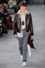 Some wore businessman clothes such as camel coats, trenches and lightweight topcoats, some of which were slit up the sides. Suits were fitted while trousers flared slightly, and had little slashes at the bottom à la unzipped track suits. Other models worked a street-y look, dressed in puffers — with a lumberjack check — or a patterned bomber mismatched with plaid trousers, and a baseball cap.