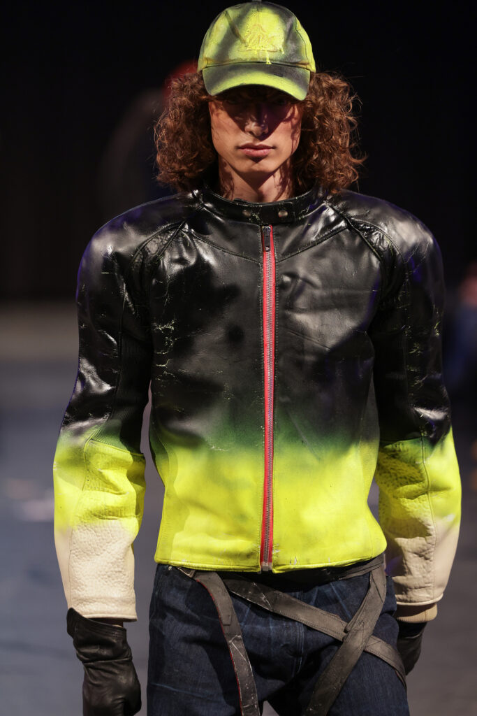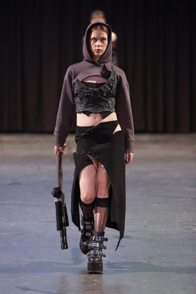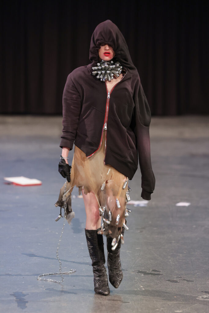 The footwear was ranging from chunky black loafers that exude an air of casual insouciance to knee-high lace-up’s and heavy black ankle boots, adding a distinctive edge to their ensembles. A pink bedazzled Mistica sneaker followed by a line-up of hardcore attire. A perfect match with the paper outfits.
