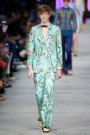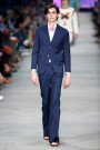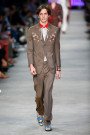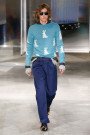 Working against a backdrop of palms and tropical greens the creative director sent out models in baseball caps wearing sports-inspired riffs on the traditional suit. Baseball style and other abbreviated jackets were done in pinstripes — some with contrast piping — and were paired with roomy, pleated trousers. More traditional suits were worn over T-shirts, or layered over sweaters accessorized with colorful skinny ties. Colors were of the earth — plum, ochre, cocoa, turquoise and palm leaf green — and came in blocks or stripes on everything from knits to outerwear. Baseball and leather jackets were adorned with cactus and monkey designs on the back — Fifties greaser style — while one sweater was paved with varsity letter patches, in keeping with the youthful spin.