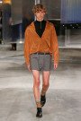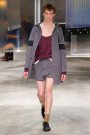 The latter motif mushroomed into pants and zippered blousons resembling pilots’ uniforms, banded or piped in safety orange and patched with utility pockets. The shorts also came in leather, shown with plunging tanks or boxy, zippered jackets.