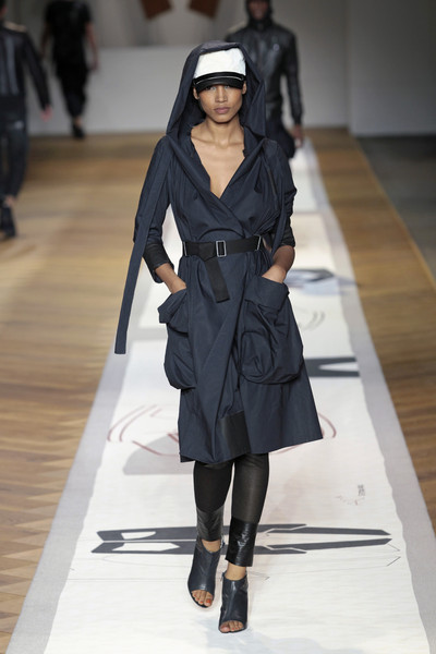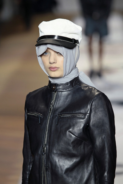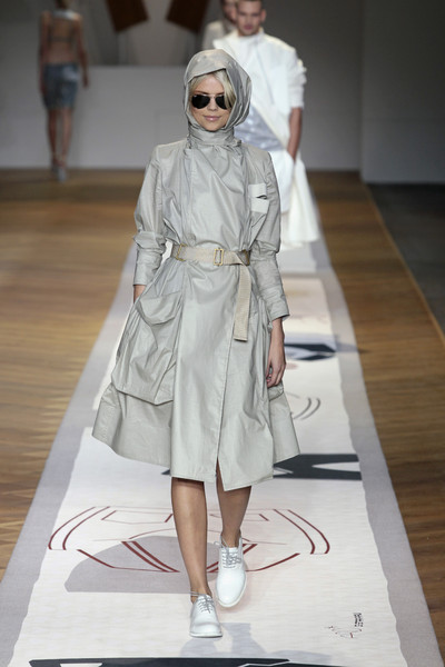 The extra functional details on most of the coats (zippers, hoodies, pockets) were inspired by the desert denim theme of the show. G-star made the high collars and head scarves worn with caps on top (meant to keep the desert sand out) look tough and streetwise.