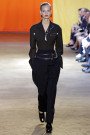 Designer Phoebe Philo tried to explore the fine line between the idea of sexuality and sensuality and translated that into the Céline-style. She opened with a sweater with belled cuffs covering the hand over wide pants in what looked like embroidered crocheted lace. The fabric would recur in a jacket over pants and a dress, all chaste of silhouette but revealing of skin via random devoré windows. Philo also did a turn with lingerie, corsets undone and deconstructed over slipdresses and deliberately ill-fitting conical bras. Sweater dresses covered up in front flashed circular, open portholes in back.