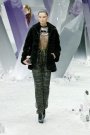 There were senses of both classic Chanel and classicism upended. Suits, some with blouson jackets, were crafted from puffed squares of paper-thin leather; others, in tweedy plaids, featured skirts with deep bias borders. But Lagerfeld also made a big show of sportif, as in separates, Chanel-style: patterned sweaters and skirts under glittering parkas; sweater, skirt; cardigan layered over classic jacket and jeans; V-neck pullover stretched into a sweater gown.