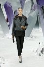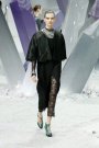 New Vintage, was the name of the haute couture collection Karl Lagerfeld presented yesterday. Because Vintage is soooo depressing Lagerfeld thinks. New Vintage is something to come, he states. Well, the clothes had a 1940’s line—broad shoulders, swingy coat, cape backs—in a color palette of black, gray, silver, and dusty pink that spoke of film noir interiors. The hair also had a forties flavor. The spine of the collection was suits, he paired them with sparkling legwear and wove silver through his “tweeds.”