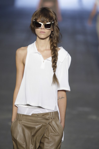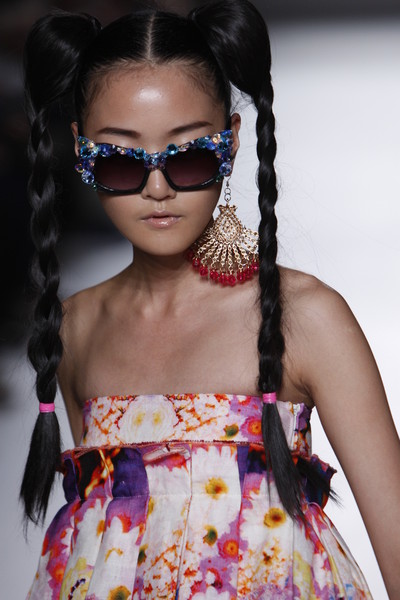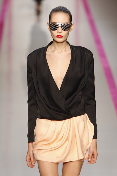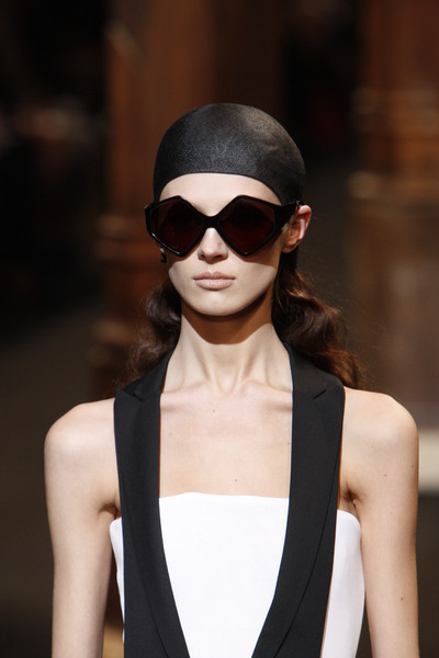 We saw a crazy pair at the Ungaro fashion show which had diamonds all over the glasses. At Alexander Wang they were very pointy. At Hussein Chalayan they were pentagonal. In the Moschino show a few pairs had the shape of a flower.