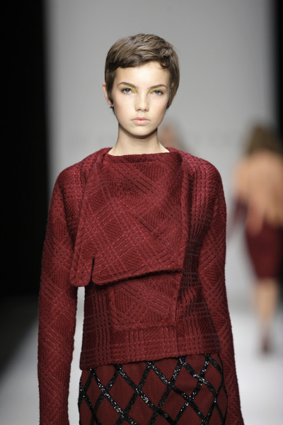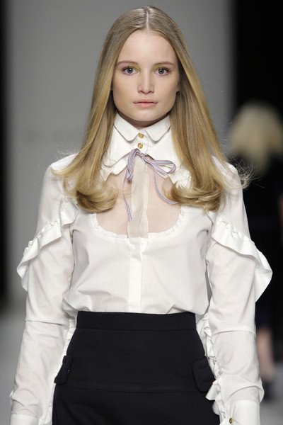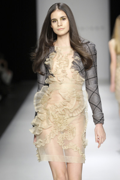 Claes showed some great designs in which heavy winter fabrics were mixed with transparent organza. From under some skirts and dresses was a transparent layer visible. A checked skirt was matched with a floralprinted blouse. All blouses had a small cute collar.