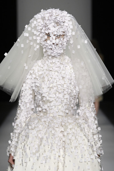 At the ending of the show a model appeared in a white wedding dress full of price tags. But not only the dress, also the model’s face and the veil of the dress had price tags added to them.