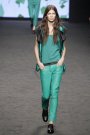And C’N’C’ used the theme beautifully in it’s new collection. Colors changed subtly during the show; from emerald green to white, yellow, nude, pink and black. Leather pants were mixed with cool tops and hoodies, all in one shade. Pants, which showed just a little bit of ankle were styled with short leather jackets. Blouses and tops made of sheer fabrics were worn over bandeau tops.