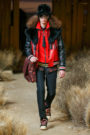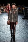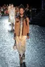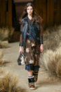 Currently, outerwear is king. Shearlings were distressed with raw edges and floral and eagle embroideries all over. Vevers pushed the shearling idea even further with a dyed hoodie style with intarsia floral designs and a full-length topper coat that was dyed several shades of brown.