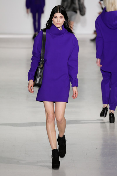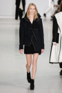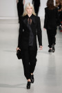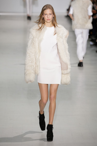 Apart from an all red look and a selection of full on purple ensembles Costume National told a true monochrome story today. Fresh faced models (hardly any make-up, hair undone; the kind of streetstyle coolness we know from most French editors) worked the modern, cool f/w2014 collection, which formed the ultimate mix of menswear inspired creations (pinstripes, boxy fits, large collars and suits) and elegant feminine designs (sexy dresses, sheer blouses and lots of (faux?) fur. Like the first crispy white look with a pair of loose fitting pants, brogue shoes and a winter proof fur waistcoat, worn carelessly, hands in the pockets. Followed by a more sexy attire, short dress, bare legs, high heels. A few navy & black designs were less impressive, but other than that, f/w 2014 just felt right. The CN woman is not trying to hard to fit in. She’s not desperate to look sexy or desirable. And she doesn’t dress the way she dresses for anyone else but herself. That’s why the CN woman, or girl if you will, is so damn hot. Yes, especially in that tux-inspired black suit at the end.