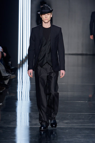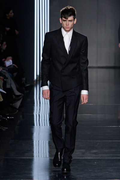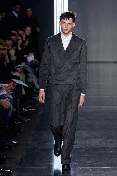 The Costume National Homme collection was about travellers and curious adventurers. According to us it was more about new wave, eighties and small suits for older boys. Lots of white, black and grey with a hint of green, a small silhouet and ankleboots.