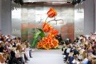 To stress the floral theme large flowers were the backdrop of this couture show. Plus, the model’s heads were packed in colorful plastic, like bouquets.