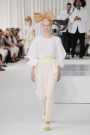 The models walked through the sunlit space at Pier 59 Studios in vivid combinations of red, white, pink, yellow and aqua blue with pert straw bow headpieces while the band Negro Helado, dressed in white tuxedos, performed throwback easy-listening tunes. Daywear was done in architectural shapes — sportswear in sculpted but minimal curves — in mostly ivory punctuated by a pop of fluorescent yellow or orange.