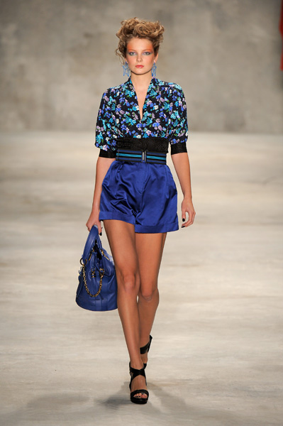 Forties-style meeting disco seemed the overall theme of Derek Lam’s spring summer collection. Lots of color, lots of feel good, easygoing clothes. He showed a sweet little floral-blouse-high-waisted-shorts combo, a great-looking dark denim zip-front jacket, and retro swimwear in which you only lounge. Stars were everywhere. Small like polka dots on a belted dress. A bigger multicolor print was used for a sleeveless blouse tucked into corseted trousers. And then there was a sundress, patchworked together from black and white poplin with a big star front and center. It was enough to make you nostalgic for a summer by the beach.