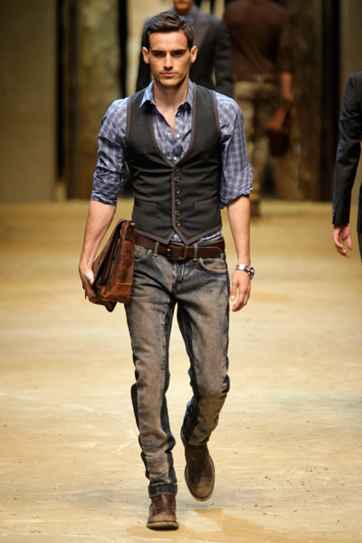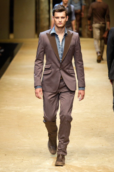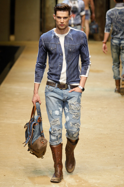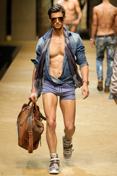 The D&G- ss2012 show brought us back to the years that Gianni Versace reigned men’s fashion with his large foulard-prints. But the designers at D&G went a bit further, they not only used the prints for shirts, they also mixed them with denim in pants, showed them on bermudas, hats, suede moccasins, jackets and T-shirts. And every which way and loose, loose being the operative word for flowing shirts, low-crotch pants and roomy swimming trunks. We’ve got the message indeed.