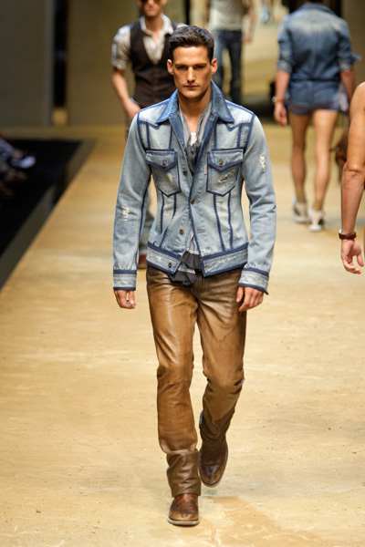 Jeans are one of the few things in fashion that never go out of style. On the contrary other denim outfits seem to come and go every few years. For the coming season several brands carefully introduced a few denim designs. We saw denim blouses, skirts and dungarees. At Jean Paul Gaultier streetwise models wore darkblue denim overalls. The designs were immediately recognizable as JPG’s because of the cone-bra details he added. Dolce & Gabbana used denim in both their collections. At the D&G western inspired show denim was mixed with white, beige or brown in almost every look. Pieces of lace or leather were stitched at the designs. For her first collection for Twenty8Twelve Sienna Miller also created some denim blouses and tough-looking sleeveless denim motorjackets with frayed ends. Hannah MacGibbon designed exactly one denim look for Chloé. It didn’t match any of the other outfits from the show, but she came up with it at the right time. (Tess van Daelen)