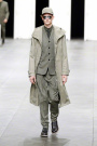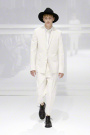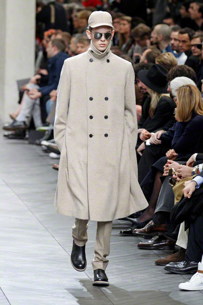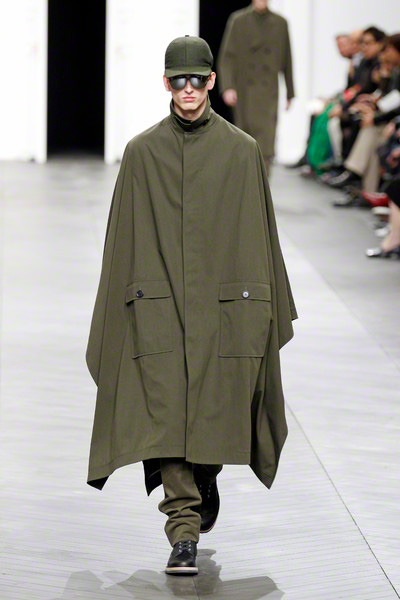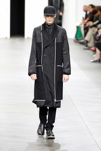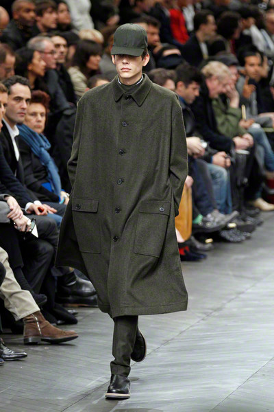 Floor sweeping trenchcoats, hooded robes and cropped suits with boots dominated the collection. Innovative variations on the classic suit, which van Assche slashed and distorted, giving it new proportions and a faux Amish Country silhouette. Luxury, creativity and comfort were the guiding principles of this fall-winter 2010 menswear collection.