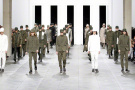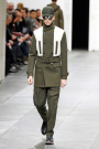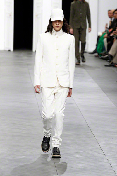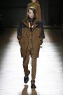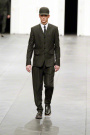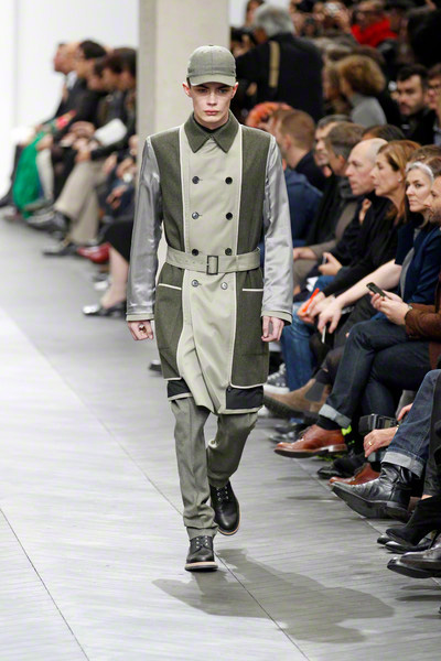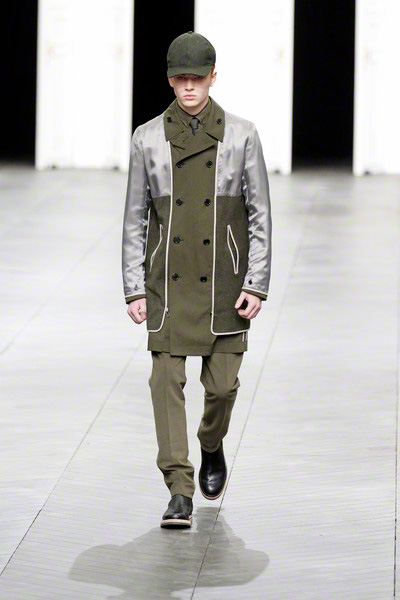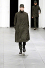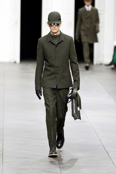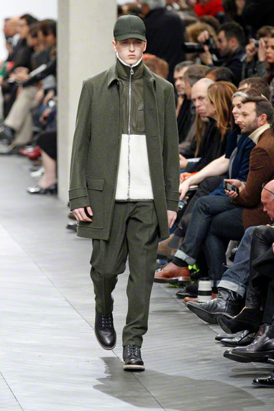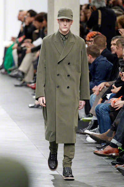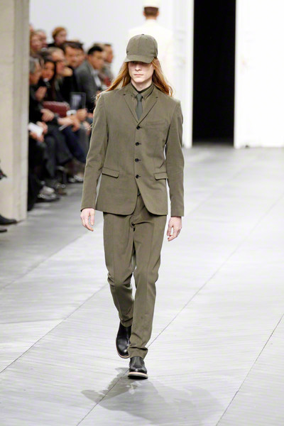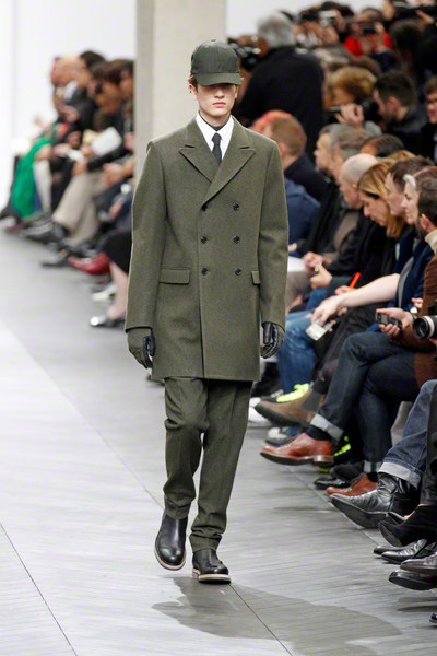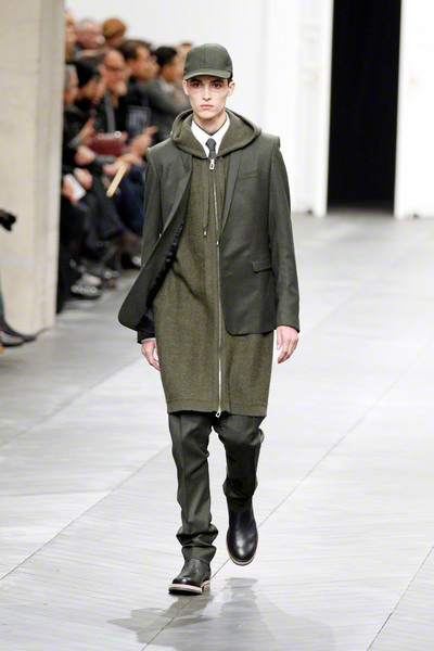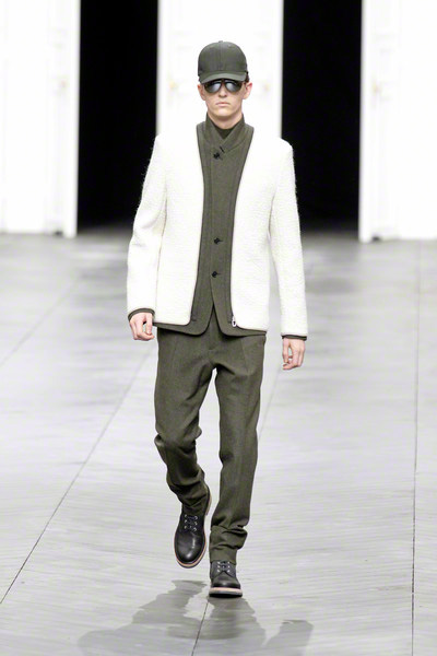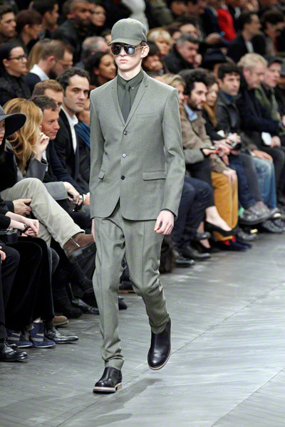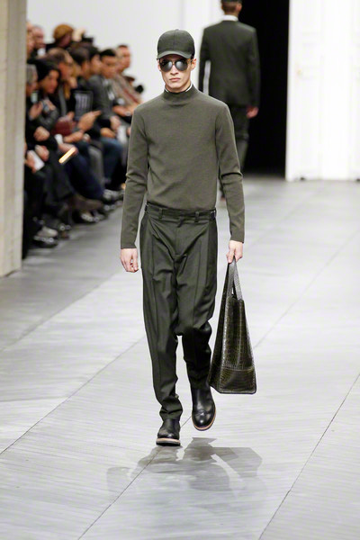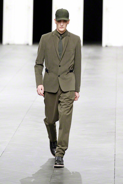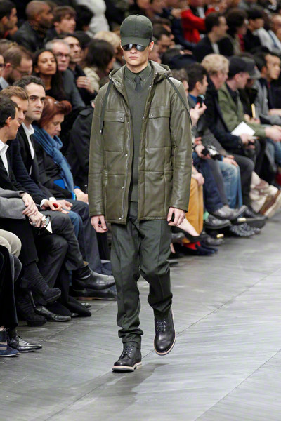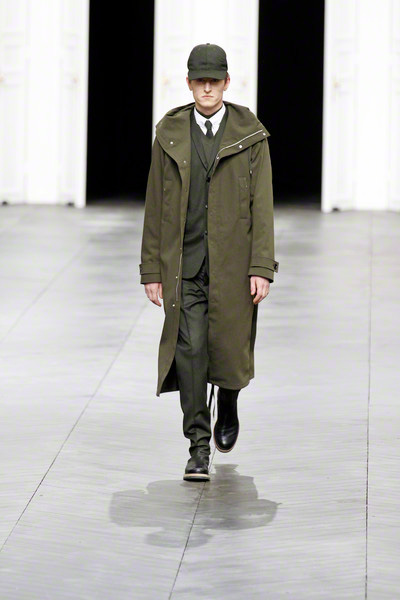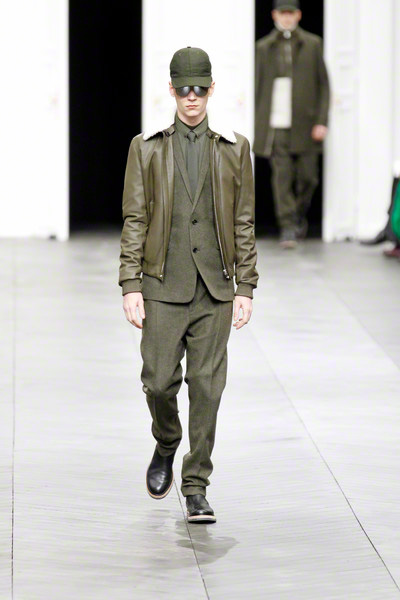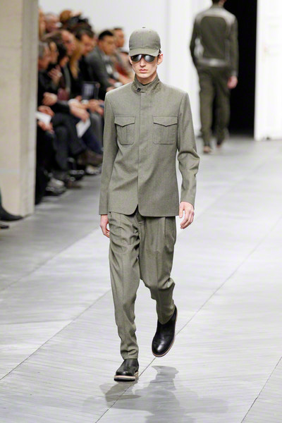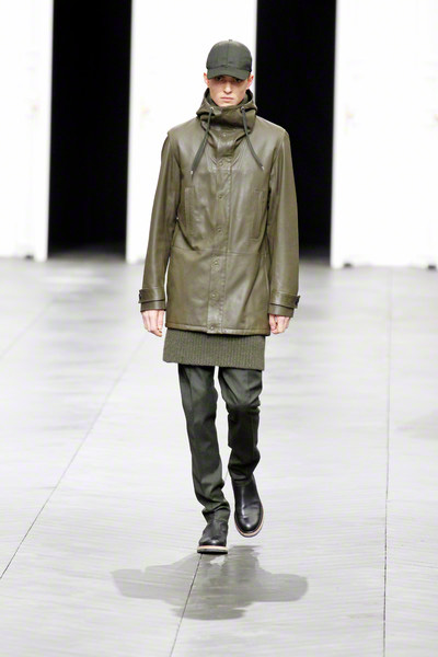 Military-inspired looks in army green opened the show. Pleated pants with neat suit jackets, long powerful coats, subtle turtlenecks, a long hooded sweater and some leather jackets looked impressive.