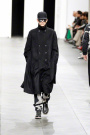 Working in a reduced palette of black, charcoal and oatmeal, the Belgian designer served up oversized jackets with long, fluttering front panels that tapered into dangly V-shapes, pairing them with generously cut cropped pants. Some of the jackets were fitted with trompe l’oeil flaps on one side, while others had lapels that morphed into scarves.