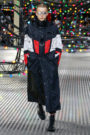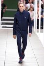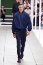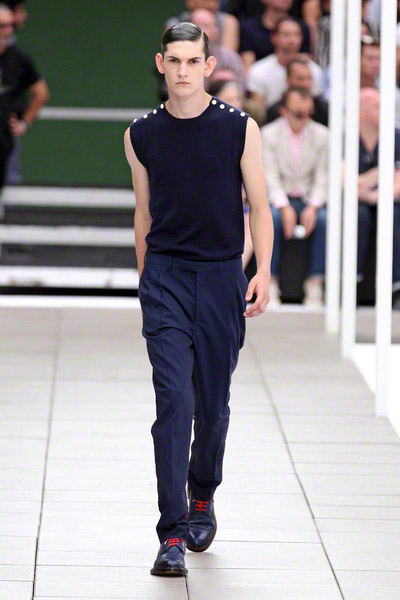 The models zoomed through Dior Homme’s suspended roller-coaster set so swiftly that one would think they were on skateboards. Just when one thought athletic influences were running out of breath, Dior Homme gave them a second wind: from the stripes running over the sleeves of two-button jackets to the tracksuit chevrons painted with a roller onto suit and coat sleeves.