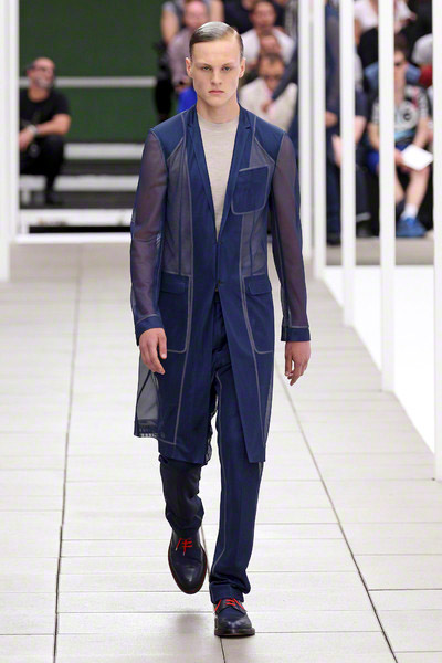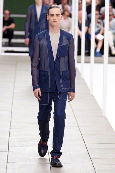Van Assche knows how to turn an idea over and over, tweaking it: showing a blazer, then shearing its sleeves, then removing its back. But the concept became skin when Van Assche rendered a few jackets and coats in nylon mesh, the better to show the construction inside.