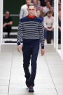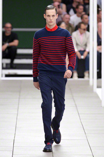 They looked handsome rather than feminine, vaguely recalling the neatness of military uniforms, though the designer said backstage he was careful to avoid that reference. As the show progressed Van Assche loosened things up, blending in Nineties sportswear hinged on tribal tattoo prints, wide-legged jeans and layers of striped knits. Untied laces, on dress shoes and canvas sneakers alike, also telegraphed that point.