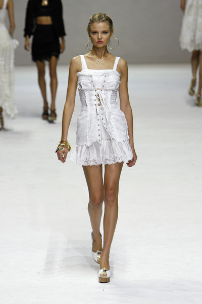 It was a good show in terms of models, music, pace and atmosphere. But the set up seemed repetitive with collections shown before, not only the theme but also with a parade of models dressed alike at the finale and the clothes. There was no color at all, besides a few flowerprints in blue and green. Black, white and the leopardprint played a leading role, as did lace, broderie anglaise, cotton and boudoir-like items as babydolls and bloomers. Tube-dresses were followed by skirt-suits, long dresses, mini-dresses and tunics. It was a sweet collection from a commercial point of view, but I hope the designerduo will continue to use their main line as their playing garden and come up with some fresh and intriguing. One line with a different worked out concept every season- D&G – is enough.
