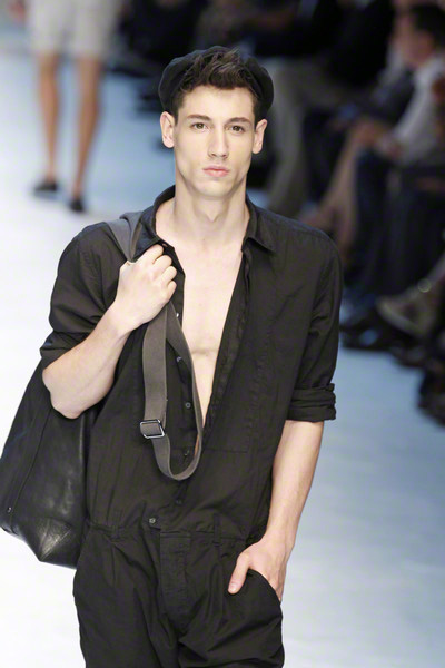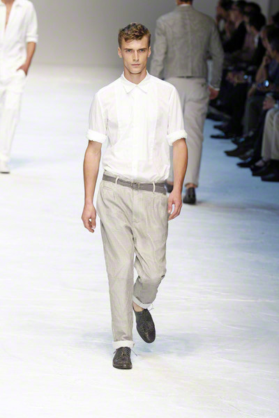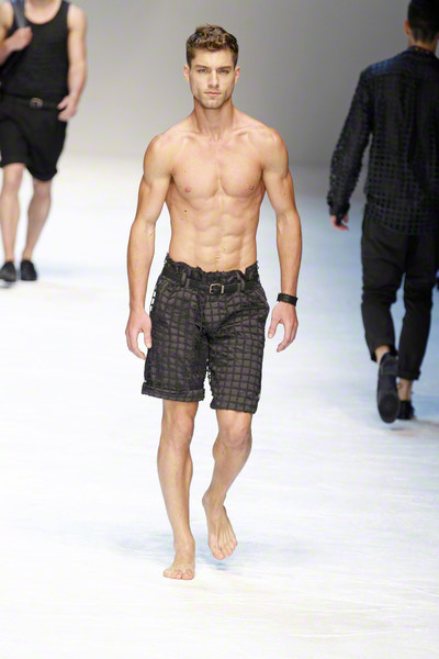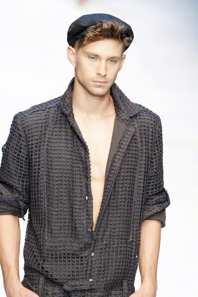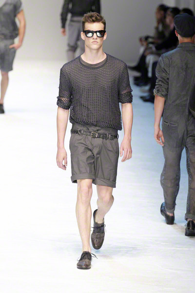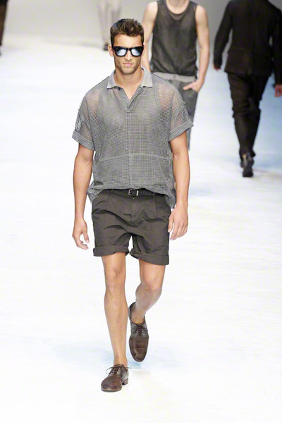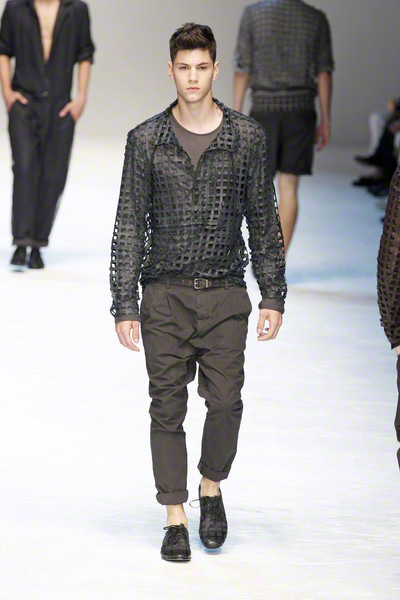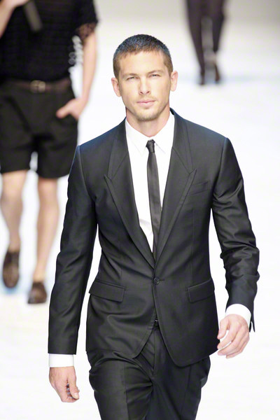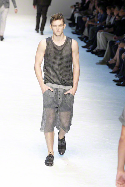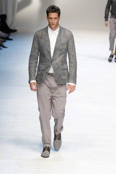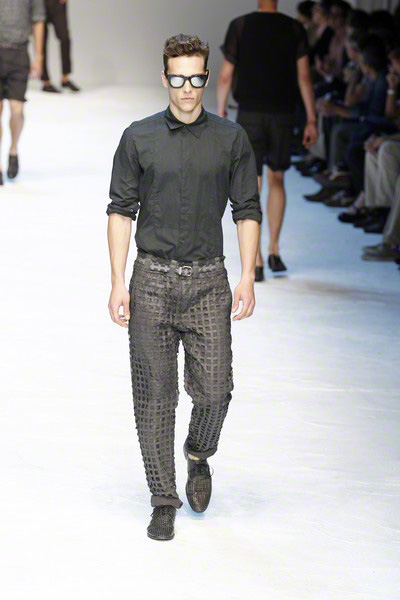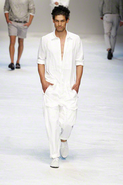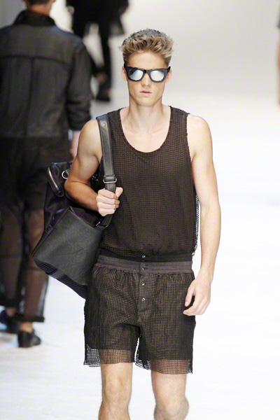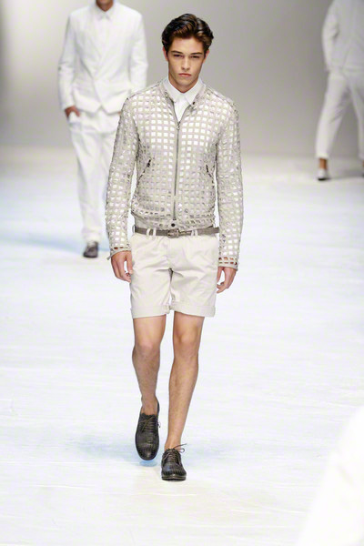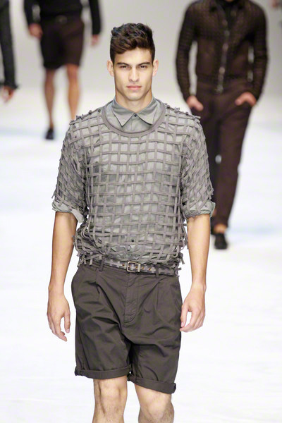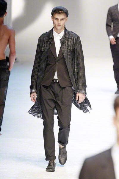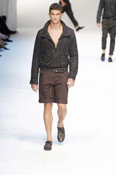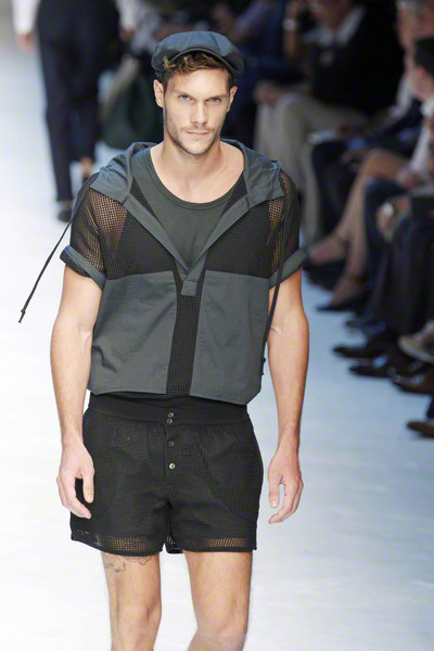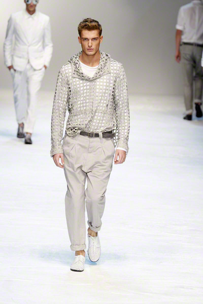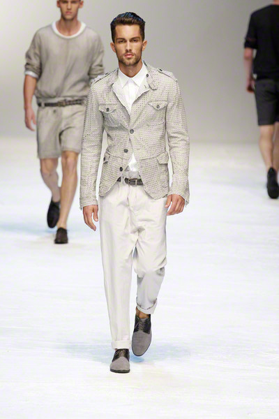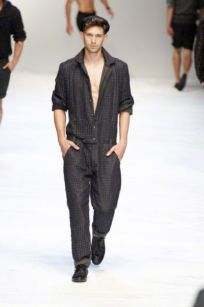 In a press conference video Domenico and Stefano did something designers rarely do; they introduced there favorite models. Paolo Anchisi, Travis Bland, Adam Senn, Tim Ruger and Guy Robinson. Those guys wore the showpieces of new summer collection. A cotton jumpsuit, a netted leather T-shirt, a perforated leather jacket and a lightweight collarless jacket. After that some details were highlighted, like small pockets, 1 cm stitching and washed satin. Just to give you an idea of the collection.