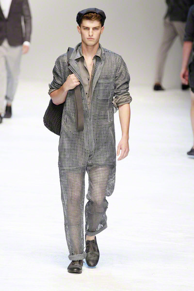 Today at Dolce & Gabbana it was all about the net and the nets. Perforated and netted items were seen throughout the whole collection. A collection which started off quite dark (black and burgundy), but became lighter (white and light grey) towards the end.