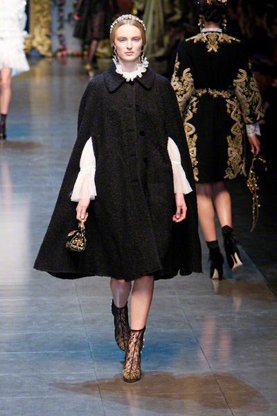 It seemed a never ending collection that Dolce & Gabbana sent out this afternoon. A collection that captured Italy’s love for drama and opera. Pavarotti was on the soundtrack singing O sole mio and out came the models dressed in baroque black velvet and gold brocade, covered with dramatic capes, dresses embroidered with images of painted old theater-ceilings. Even the earrings looked like little cherubs and shoes reminded of theater furniture and decorations.