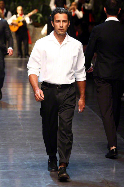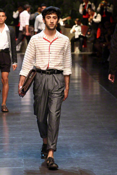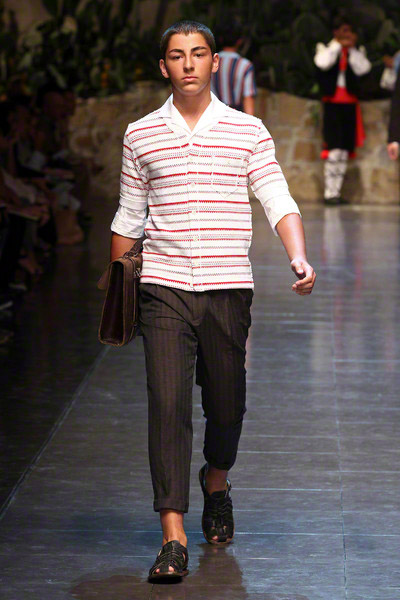 Domenico Dolce and Stefano Gabbana continued their hymn to Italy. This time they time-traveled to Sicily for a nostalgic Fifties spring collection. Around 70 boys and men where gathered from all over the island and they resembled characters from an old movie as they sped down the runway to a frenetic pace set by a live folk band.